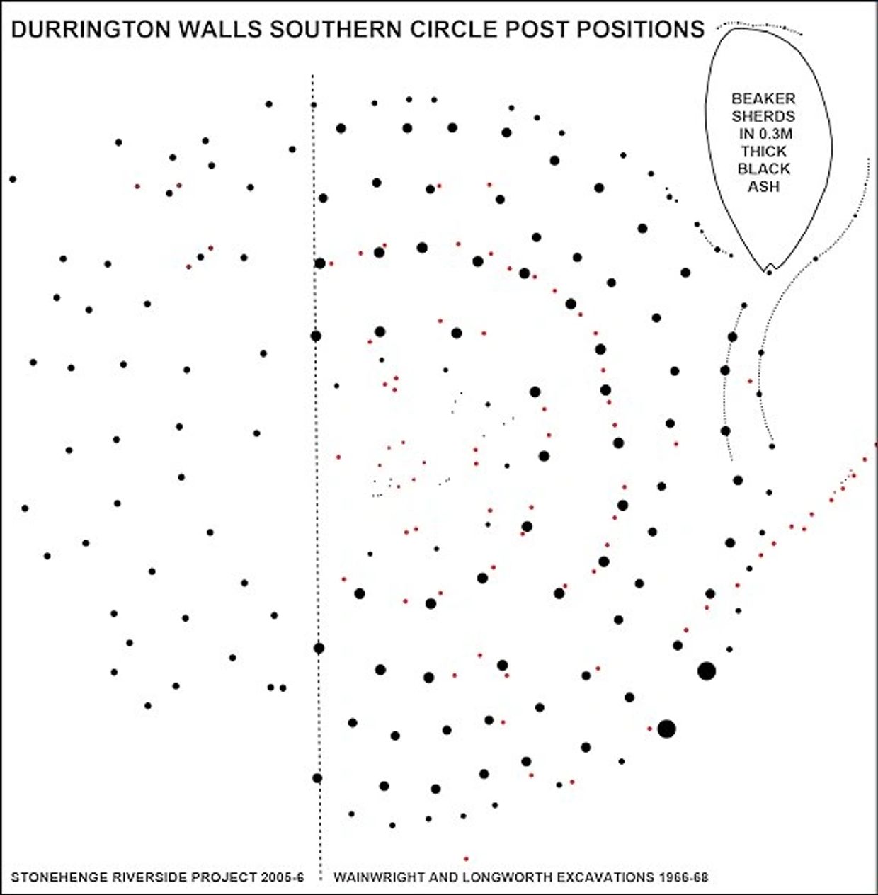 Ashes from a cremation alongside a geometric timber egg known as the Southern Circle were transferred to a ‘Midden’ and enriched with many beaker sherds. People's bones had been carefully sifted and taken to be buried in the Aubrey Holes of Stonehenge. This left some very restless spirits behind – as was the intention.