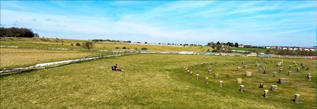 Cutting through those trees is the Countess Road, built post-1968. This new highway is elevated several feet above the pan-shaped valley, which early folk had cordoned off to make Britain’s largest henge. Note the blue farm vehicle parked beneath the new road's embankment because that vehicle very nearly marks the centre of the timber egg known as the “Southern Circle.”