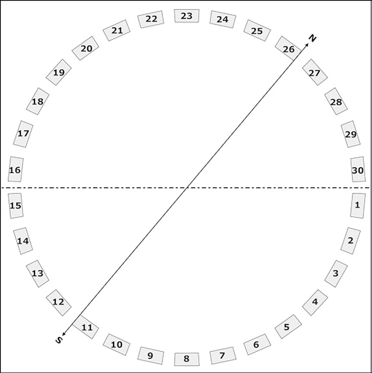 Nonetheless, the plan was to erect the megaliths twelve degrees apart, leaving gaps of four degrees between them. And we know those early folks had accurately divided the compass into 360-degree parts, as was found scribed on pottery in Devon and Dorset.