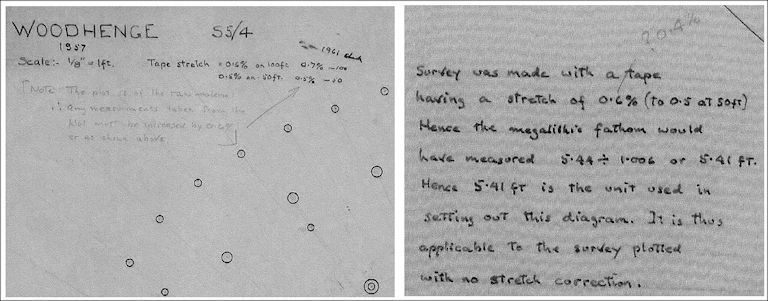 "Survey was made with a tape having a stretch of 0.6% (to 0.5 at 50 feet). Hence the megalithic fathom would have measured 5.44 divided by 1.006 or 5.41 feet. Hence, 5.41 feet is the unit used in setting out this diagram. It is thus applicable to the survey plotted with no stretch correction."