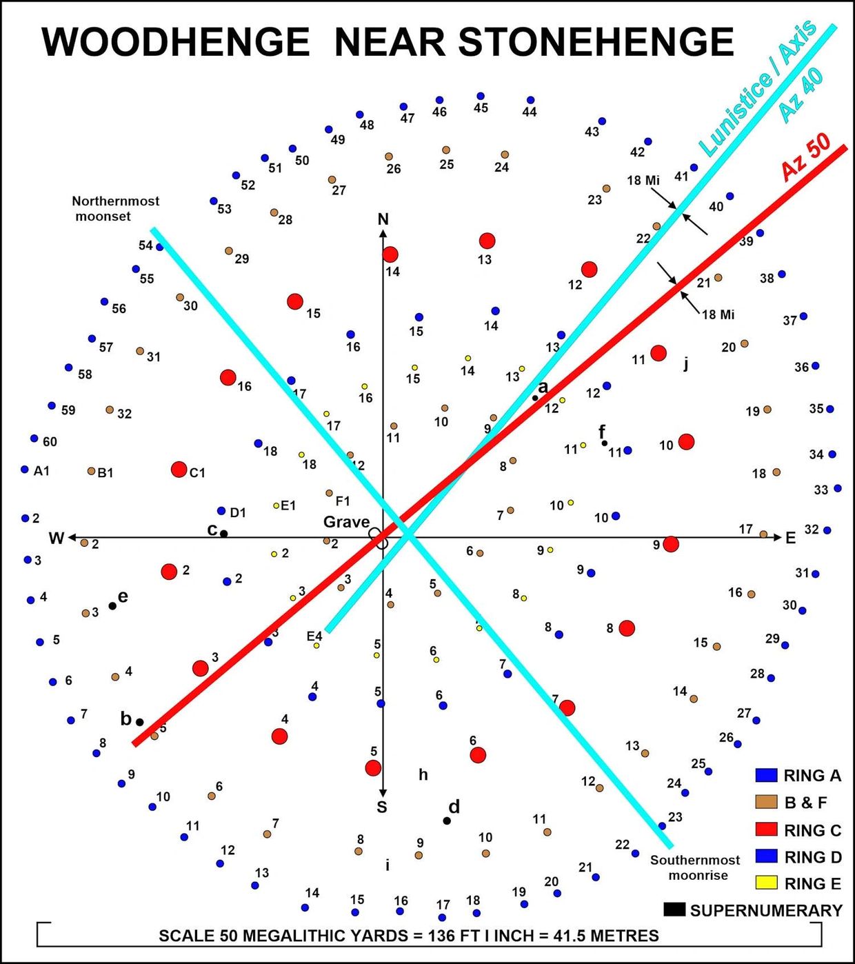 Axis of rings (From Cunnington’s book of Woodhenge) AB 36.5, CF 40.5, and DE 43.5 degrees.